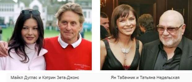 Разумеется, есть и счастливые примеры: Олег Табаков и Марина Зудина, Андрей Кончаловский и Юлия Высоцкая, Майкл Дуглас и Кэтрин Зета-Джонс, Ян Табачник и Татьяна Недельская…